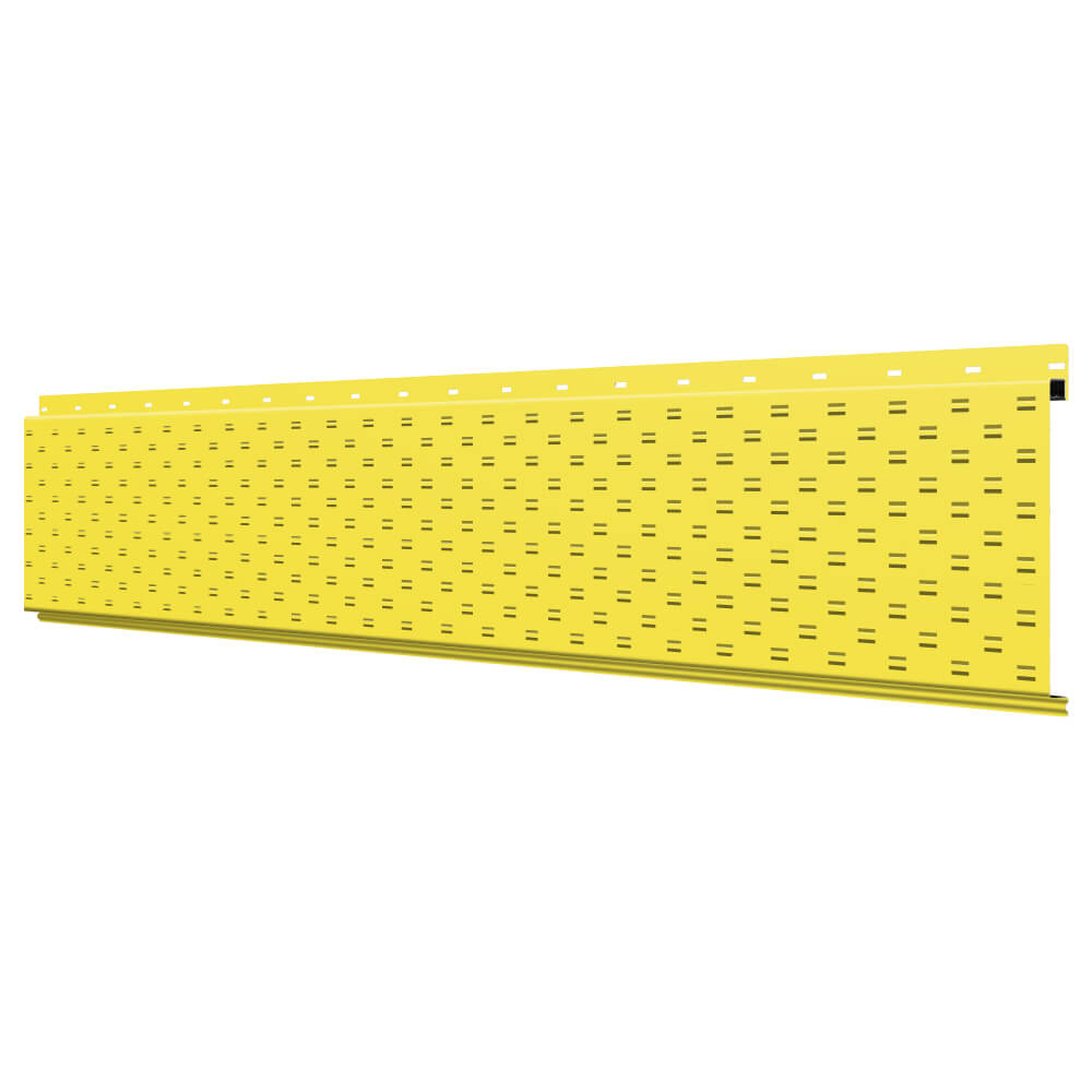 Линеарная потолочно-стеновая панель с ПЕРФОРАЦИЕЙ для вентиляции цвет RAL1018 Желтый применяется в качестве софитов для подшивы крыши, наружной и внутренней отделки потолков, стен, фронтонов фасада дома в Махачкале.